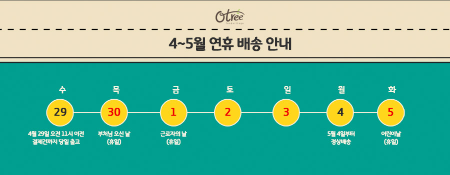4월~5월 황금연휴 배송안내 최고관리자 공지 0 2470 2020.04.29 11:24 4월30일~5월5일 황금연휴 배송안내4월 29일 수요일 오전 11시까지 주문분 >> 4월 29일 한진택배 배송출발4월 29일 수요일 오전 11시 01분 이후 주문, 결제 완료분 >> 5월 4일 월요일 배송출발5월 4일 오전 11시까지 주문, 결제 완료분 >> 5월 4일 월요일 배송출발5월 4일 월요일 오전 11시01분 이후 주문, 결제 완료분 > 5월 6일 수요일부터 순차배송 출발 배송일자 참고부탁드립니다.즐겁고 안전한 연휴를 즐기시기 바랍니다 !! 황금연휴, 배송,