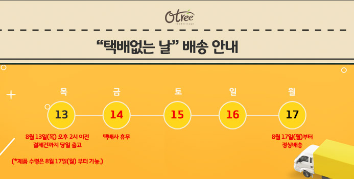 조금만 기다려주세요 ^_^ 택배없는 날 입니다~ 최고관리자 공지 0 2408 2020.08.13 09:18 안녕하세요 맘쿡입니다.택배기사님들에게 조금의 여유를 드리고자 기획된 '택배없는 날'에 맘쿡도 동참합니다. 2020년 8월 13일 오후 2시까지 주문, 결제 완료분 > 8월 13일 한진택배 배송 출발 > 8월 17일 월요일 도착 예상2020년 8월 13일 오후 2시 이후 주문, 결제 완료분 > 8월 17일 월요일 배송 출발 참고부탁드립니다 ^^