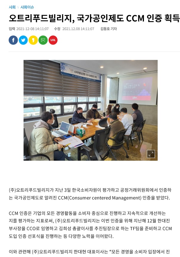 (주)오트리푸드빌리지가 지난 12월 3일 자사 제품에 대한 인식 및 대외 경쟁력 제고를 위한 CCM (Consumer centered Management) 인증을 획득했다.