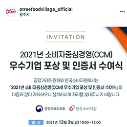 (주)오트리푸드빌리지 소비자중심경영 CCM 인증획득 최고관리자 0 1891 2021.12.08 16:08 https://www.instagram.com/p/CXNlyYpPPU0/?utm_medium=copy_link